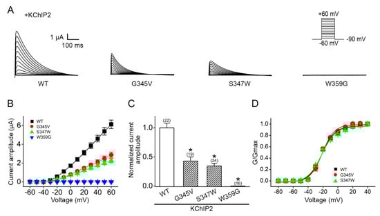 Similar to other KV channels, the KV4.3 subunit comprises six transmembrane segments (S1–S6) and an ion selectivity filter containing a pore loop in the S5–S6 linker region. The disease-related variants of p.G345V (a variant which was previously reported in a SCA19/22 family [], but not functionally evaluated), p.S347W, and p.W359G are all located in the extracellular region of the S5–S6 linker close to the S5 transmembrane segment (Figure S1). The sequence alignment analysis shows that the G345 and S347 residues are well conserved among vertebrates while the W359 residue is a variant shown in worms. In particular, the p.G345V and p.S347W changes both modify a loop proximal to the pore while p.W359G directly alters one of the helices that form the pore and the selectivity filter (Figure 2).