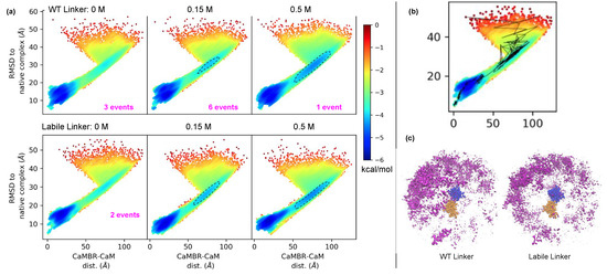 To investigate how the CaM’s linker flexibility affects the binding process between CaM and the CaMBR of CaN, we performed extensive binding simulations using the Martini CG model with two CaM models that have WT and labile linker flexibility, respectively. The linker flexibility was controlled by setting its secondary structure property in the Martini model, hence a linker with a higher helical character was more rigid than a coil. For the target-free CaM crystal structure (PDB 3CLN), the linker (residues 73–87) was anticipated to have moderate flexibility. This was based on the DSSP result [52,53] suggesting that a four-residue ‘hinge’ spanning residues 78–81 assumed a ‘turn’-like (T) secondary structure, whereas the remainder was ascribed rigid alpha helical character. For the labile linker we assumed the entire linker consisted of coils and turns. To study the contributions of long-range electrostatic interactions in driving assembly [63,64], we performed 200 simulation trials at 0, 0.15, and 0.5 M ionic strength, respectively. In Figure 3 we show the projection of the trajectories onto two axes: (a) the CaMBR/CaM center of mass distance (b) the RMSD to native CaM/CaMBR complex crystal structure PDB 4Q5U to visualize the sampled conformational space. The population densities in the projected space were used to infer the potential of mean force () by inverting the Boltzmann equation.