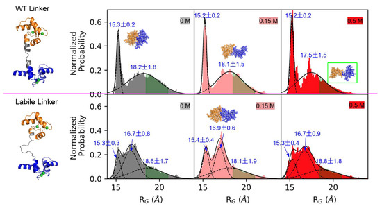 To determine the basis for how the labile linker reduced the probability of achieving native-like bound states, we calculated the radius of gyration () of CaM just prior to forming the loosely-bound ensemble. In the WT linker CaM model, the distributions were fitted to a two-peak Gaussian distribution with maxima at 15.2 and 18.0 Å for all three ionic strengths. These two peaks corresponded to a highly compact structure and an extended structure, respectively. This distribution was consistent with the extended [47] and compact CaM [68] structures that have been experimentally-observed in the absence of a target. Transition path calculations have suggested that the extended CaM formation was slightly more favorable than the compact one with a ∼3–4 kcal/mol theromodynamic advantage and these two CaM states were separated by a ∼10 kcal/mol barrier [69]. Our data of the WT linker CaM model qualitatively agreed with these transition path results, as the integrated extended CaM probability density was greater than that of the compact states. Moreover, the probability densities did not significantly overlap.