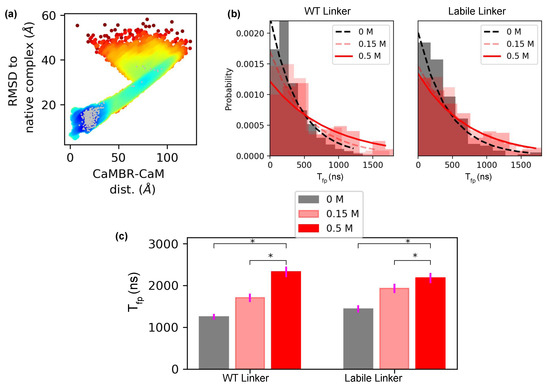 (a) Locations of loosely-bound state complexes, which were defined as those having at least 50 intercontacts between CaMBR and CaM. (b) Distribution of bootstrapped s from a sample consisting of 200 simulation trials (with replacement). The distribution was fitted to to assess the convergence of the distribution of values. (c) Average after bootstrapping using 1000 samples. Because Martini CG’s time scale is four times faster than all-atom simulations [51], the obtained from Martini CG has been multiplied by four to match all-atom time scale. The p values between the ionic strengths were calculated via Welch’s t-test, where * signified p < and thus the difference of the means are significant.