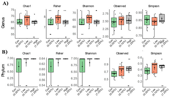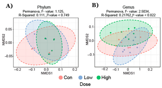 Fecal microbiota analysis was performed on three groups (21 total samples): control diet (n = 7), TRP-deficient diet (n = 7), and TRP-rich diet (n = 7). We analyzed the gut microbiota composition using the 16S rRNA amplicon sequencing of fecal contents and observed distinct differences in the microbial taxa associated with TRP dose variation. Microbiota diversity is typically described in terms of within (i.e., α) and between sample (i.e., β) diversities. α-diversity indices both at the phylum and genus level were not different between the groups of mice that were fed different doses of TRP (Figure 1). Non-metric multidimensional scaling (NMDS) ordination plots using a Bray–Curtis distancing matrix of β-diversity revealed significant differences at the genus levels (Dose, p < 0.05); however, at the phylum level there were no differences due to the TRP content in the diet (Figure 2).