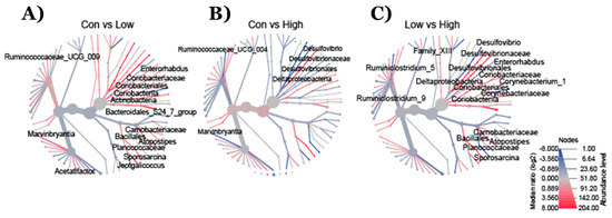 (A) Phylogenetic heat tree illustrates the differences in relative bacterial abundance between groups. The data show the changes in the bacterial families in mice fed (A) TRP-deficient/low compared to TRP-normal, (B) TRP-rich/high compared to TRP-normal, and (C) TRP-rich/high compared to TRP-deficient diets. Control diet (n = 7), TRP-deficient diet (n = 7), and TRP-rich diet (n = 7). Red nodes represent more abundant bacterial families, whereas the blue nodes represent less abundant bacterial families.