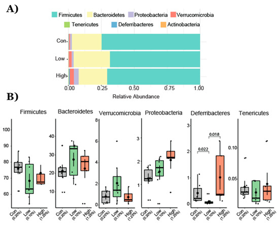 Operational taxonomical unit (OTU) abundance at the phylum level in animals fed with TRP-normal, TRP-deficient, and TRP-rich diets. (A) Relative increase in Verrucomicrobia and Bacteroideate and decrease in Firmicutes and Deferribacteres. (B) Box and whisker plots depict the operational taxonomical units (OTUs) from different bacterial phyla presented among three groups of mice. p values are shown where the differences were found to be significantly different from each other. Cont (control 0.2% TRP, n = 7), def/low (0.1% TRP, n = 7), and high/rich (control 1.25% TRP, n = 7).
