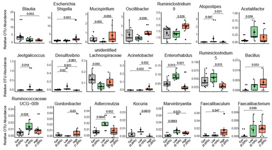 BIOM files were analyzed using MicrobiomeAnalyst—a web-based tool for the statistical and visual analysis of microbiota data. Reads were initially denoized using filters with a minimum number of five reads in a minimum of one sample required to retain an OTU. Total read counts for the run were 754,355, with 35,921 per sample. Sample reads were normalized and rarefied to the minimum library, then data scaling (total sum scaling) was performed before the final analysis. Minimum read filtering was applied in MicrobiomeAnalyst for alpha and beta diversity calculations but was increased to a minimum of 10% prevalence with a count of 4 for differential abundance analysis. Low variance filter was set at 5% for the inter quartile range. Alpha diversity profiling and significance testing were conducted using one-way ANOVA at the genus and phylum taxonomic level. For beta diversity, permutational MANOVA (PERMANOVA) was used to compute groupwise differences. Differential abundance was calculated univariately. All p-values were calculated using the Kruskal Wallis test and the Dunn test unless stated otherwise. Microbiota figures (Figure 1, Figure 2, Figure 3 and Figure 4) were prepared using open licensed software R.