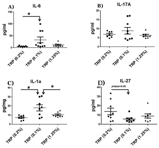 Serum cytokine levels in animals fed with a control diet, a TRP-deficient/low diet, and a TRP-rich diet. Serum was collected at the end of the experiment (week 8), followed by ELISA for immunoreactive (A) IL-6, (B) IL-17a (C) IL-1a, and (D) IL-27. Results are means ± SD (n = 7–9/per group). Data were analyzed by ANOVA followed by Bonferroni post hoc test or t-test (* p < 0.05, # p < 0.01).