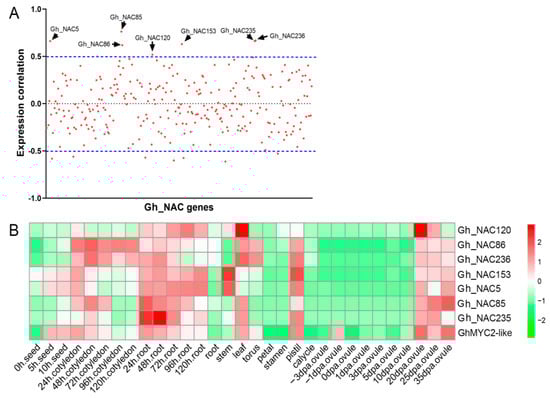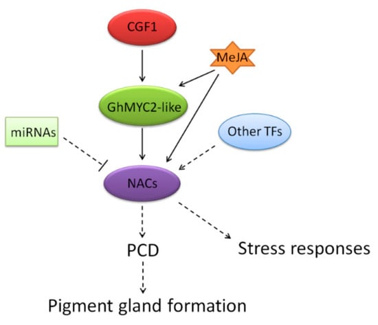 Cheng, H.; Feng, X.; Zuo, D.; Zhang, Y.; Wang, Q.; Lv, L.; Wu, C.; Li, S.; Dai, Y.; Qu, D.; et al. Gene Expression Correlation Analysis Reveals MYC-NAC Regulatory Network in Cotton Pigment Gland Development. Int. J. Mol. Sci. 2021, 22, 5007. https://doi.org/10.3390/ijms22095007