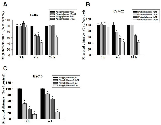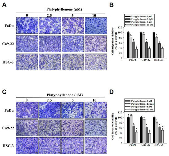 2.3. Platyphyllenone Inhibits Migration and Invasion of Human Oral Cancer Cells