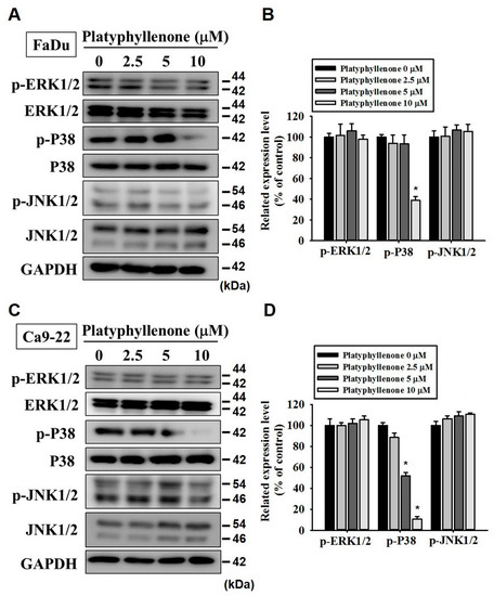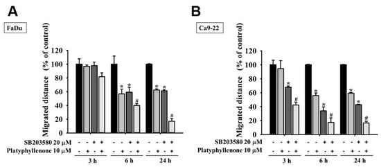 2.4. Platyphyllenone Reduces Motility of Human Oral Cancer Cells by Modulating p38 Pathway