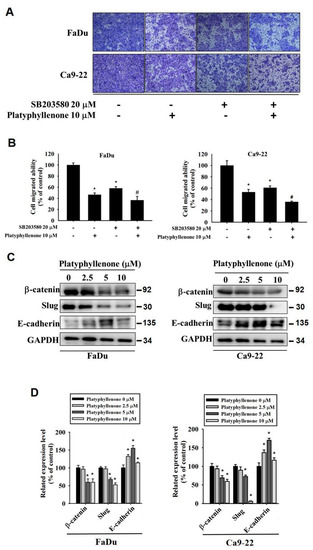 2.5. Platyphyllenonealters Expression of Epithelial–Mesenchymal Transition Proteins