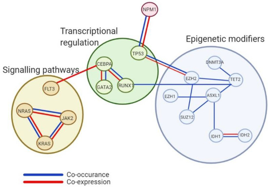 Analysis of co-occurrence and co-expression of epigenetic genes and other cellular regulatory processes. Interactions shown between genes considered to possess epigenetic modification processes and other cellular processes like transcriptional regulation and signalling and kinase pathways highlighting the intricate pathway association needing accounted for in the progression of knowledge around mutational profiles within myeloid malignancies.