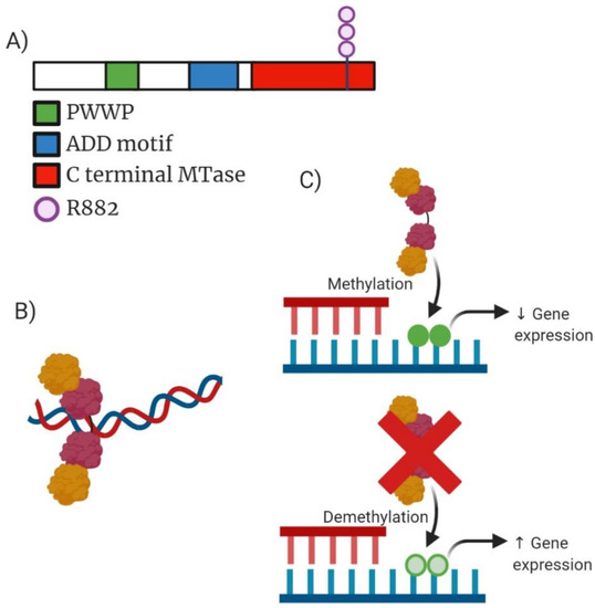 Analysis of DNMT3A molecular structure, active tetramer structure, mechanism of action and drug target action. (A) Domain structure of mammalian DNMT3A enzyme consisting of 912 amino acid residues. Green highlighting PWWP domain which is required for directing DNA methylation. Blue highlighting ADD (ATRX-DNMT3A-DNMT3L) motif responsible for mediating protein–protein interaction to transcription factors. Red highlights the C-terminal MTase domain contains highly conserved regions of C5-DNA methyltransferases. Additionally, highlighted is the structural position of the most common mutation occurring within DNMT3A (R882). (B) Active tetramer formed from two DNMT3A and two DNMT3L molecules resulting in an increased affinity for DNA causing more efficient methylation. (C) Mechanism of action for both wild-type (WT) DNMT3A and the truncated mutant DNMT3A. WT DNMT3A causing methylation which can reduce expression of gene expression compared to mutant DNMT3A which can often result in increased expression of genes depending on the context of the cellular function occurring.