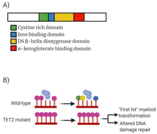 The oxidation process of 5-methylcytosine to produce 5-hydroxymethylcytosine (5hmC) is catalysed by the TET-enzymes which is dependent on alpha-ketoglutarate (α-KG). TET2 was first discovered in 2009 with inactivating mutations occurring in MPM and AML patients, Delhommeau et al. accomplished this through mapping structural DNA rearrangements in chromosome 4q24 [34]. TET2 is a member of the TET family of proteins with mutations of this gene occurring in 15% of myeloid malignancies (Figure 3A). TET2-associated mutations have been observed in AML patients and are linked with reduced levels of 5hmC [35] as well as contribute to a poor prognosis in intermediate-risk AML [36,37].