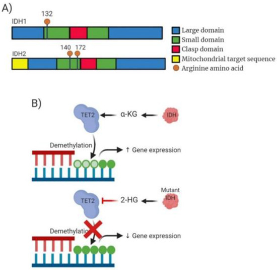 Isocitrate dehydrogenase 1 and 2 (IDH1 and IDH2) proteins catalyse the conversion of isocitrate to α-KG. Mutations in genes encoding these IDH1/2 enzymes are frequently observed in AML patients with normal cytogenetics. IDH1/2 mutations result in aberrant metabolite 2-hydroxyglutarate (2-HG) [43] where it can compete with α-KG leading to TET2 inhibition. IDH1 mutations were discovered in 2008 by a sequencing project by Parsons et al. on human glioblastoma samples and since have been identified in AML patients by Mardis et al. [44,45]. IDH2 mutations were identified based on consequent genomic studies of IDH1 in AML [46]. Mutations in IDH proteins are found in 15–20% of AML cases [47]. Mutations in these genes are less common in MDS patients occurring in 3–5% of cases and 1–4% of MPN cases [48]. Mutational hotspots in IDH1 have shown to occur at Arg132 while IDH2 mutational hotspots occur at Arg140 more frequently than Arg172 [49] (Figure 4A). Ok et al. have shown that the persistence of IDH mutations lead to increased risk of relapse for patient’s post-treatment [50].