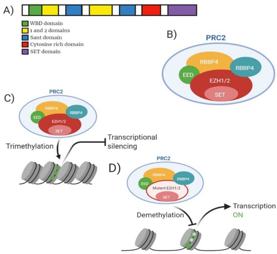 Analysis of EZH2 molecular structure, PRC2 structure, mechanism of action for wild-type and mutant and drug target action. (A) Domain structure of mammalian EZH2 enzyme consisting of 751 amino acid residues. Green highlighting WDB (WD-40 binding domain). Yellow highlighting domain ‘1’ which binds PHF1 and domain ‘2’ binding region for SUZ12. Blue highlighting SANT domain allowing interaction of chromatin remodelling proteins with histones. Red highlights cytosine rich domain. Purple highlighting catalytic SET domain. (B) Model of mammalian PRC2 complex with core subunits. (C) Mechanism of action for wild-type EZH2 showing trimethylation of H3K27 resulting in gene transcription silencing. (D) Mechanism of action for PRC2 containing mutant EZH2 showing reduced methylation of H3K27 resulting in increased gene transcription.