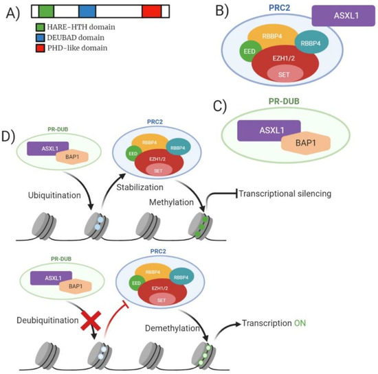 ASXL1 is a human homologue of Drosophila additional sex combs gene and generally confers a poor prognosis, the gene is located on chromosome 20q11. [52]. Majority of the mutations that occur on the ASXL1 gene are at exon 12 and are heterozygous [53]. Structurally ASXL1 contains a conserved carboxyl-terminal PHD domain along with a HB1, ASXL1 restriction endonuclease helix-turn-helix (HARE-HTH) and a deubiquitinase adaptor (DEUBAD) (Figure 6A). ASXL1 is a member of a family of three identified genes (ASXL1, ASXL2 and ASXL3) which regulate chromatin remodelling but remain poorly characterised. ASXL1 functions within the PRC2 complex enabling cell differentiation via binding to the cohesion complex; controlling chromatin separation during cellular division. Scheuermann et al. highlighted the association between the polycomb-repressive deubiquitylase (PR-DUB) complex and its ability to deubiquitylate histone H2A at lysine 119 (H2AK119) (Figure 6B,C). This function can be accomplished by the components BRCA1-associated protein 1 (BAP1) and ASXL1 [54]. The ubiquitination of H2AK119 enables stabilization of PRC1/PRC2 enabling efficient deposition of H3K27me3 (Figure 6D).