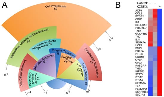 Expression arrays comparing iPSC-derived mesenchyme from a patient carrying a KCNK3 mutation to two controls. (A) Overrepresented gene ontology groups from 242 genes with 2-fold changed expression (up or down) in the KCNK3 patient compared to controls. Radius corresponds to multiple-comparisons adjusted p-value; angular width corresponds to number of genes. (B) Heat map of 30 genes whose pathways had been previously implicated in pulmonary arterial hypertension, related to vascular tone, metabolism, and inflammatory cell recruitment or adhesion. Red indicates higher expression, blue lower expression.