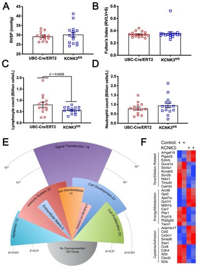 (A) Four weeks of normobaric hypoxia (10% O2) did not consistently result in higher right ventricular systolic pressures in kcnk3fl/fl mice. All mice carried the UBC-Cre/ERT gene and were Tamoxifen treated. (B) Normobaric hypoxia did not result in right ventricular hypertrophy in kcnk3fl/fl mice. (C) Kcnk3fl/fl mice had lower lymphocyte count than controls. (D) Other elements of the white blood count were normal (neutrophil count shown as an example). (E) RNA-Seq comparing lungs from kcnk3fl/fl mice to controls. Overrepresented gene ontology groups from 138 genes with p < 0.05 for change between groups and at least 1.25-fold changed expression (up or down) in the kcnk3fl/fl mice compared to controls. Radius corresponds to multiple-comparisons adjusted p-value; angular width corresponds to number of genes. (F) Heat map of 30 genes whose pathways had been previously implicated in pulmonary arterial hypertension, related to vascular tone, metabolism, and inflammatory cell recruitment or adhesion. Red indicates higher expression, blue lower expression.