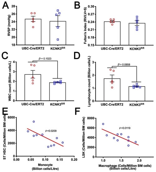 Both male and female adult UBC-Cre/ERT2 and kcnk3fl/fl mice were treated with tamoxifen, and then given Western diet ad libitum for 16 weeks. Kcnk3fl/fl and control mice gained 32% and 25% body weight, respectively (not significantly different, although trending in the same direction as prior reports []) and were approximately 9 months old at sacrifice. None of the mice—UBC-Cre/ERT2 or kcnk3fl/fl developed either elevated RVSP (Figure 3A) or right ventricular hypertrophy (Figure 3B). However, as was seen before (Figure 2C), kcnk3fl/fl mice trended to lower circulating white blood count (Figure 3C) and circulating lymphocyte count (Figure 3D). The lower numbers in this experiment prevent the trend from reaching significance, but the averages are similar to those in the hypoxic experiment. Flow sorting of bone marrow found roughly doubled short term hematopoietic stem cells (ST HSC) in kcnk3fl/fl compared to control mice (Table 2), coupled with increased Lin-Sca1+c-Kit+ (LSK) cells (multipotent progenitors) and decreased macrophages. Moreover, within the same mouse, a high level of ST HSC cells correlated to a low level of circulating monocytes (Figure 3E) and a high level of LSK cells correlated to a low level of macrophages (Figure 3F). These data strongly suggest that lymphocytes and macrophages are being produced at a high rate within the bone marrow (thus the elevated populations of precursor cells) but are being sequestered into one or more tissues (thus the low level in circulation, and the correlation between the two).