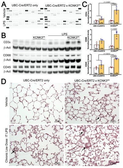 (A) Cytokine dot blot arrays indicate stronger response to chronic low dose i.t LPS in UBC-Cre/ERT2 kcnk3fl/fl homozygous mice than in UBC-Cre/ERT2 only controls. (Quantified in Table 3). Image has had Gamma set to 0.1 to make lower intensity dots more visible. (B) Western blot on whole lung shows higher levels of CD3ε+ cells (T cells), CD68+ cells (macrophages), and CD45+ cells (all hematopoietic cells) in UBC-Cre/ERT2 kcnk3fl/fl mice compared to UBC-Cre/ERT2 only controls with LPS. (C) Quantification of Western blots; probabilities are by two-way ANOVA with post-hoc pairwise comparisons. (D) H&E-stained lungs allowing visualization of increased cellularity in kcnk3fl/fl mice compared to UBC-Cre/ERT2 only controls with LPS. Black arrows represent the pulmonary vessel.