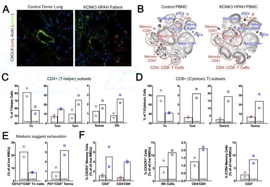 IHC and CyTOF assessment on human tissue samples validate the role of inflammation in driving KCNK3-PAH. (A) Immunofluorescence depicting increased numbers CXCL9+ cells (red) in the KCNK3 patient lung, around the muscularized vessels (green), 400X magnification. (B) 2D density contour expression of mass immunotyping of KCNK3 PBMCs. (C and D) Naïve T cells are downregulated in KCNK3 PBMCs, compensated through the upregulation of central and memory cells in CD4+ and CD8+ population. (E and F) CyTOF findings verify the role of cell mediated immune response in KCNK3 subjects through the dysregulation of CXCR3+, CX3CR1+, CCR4+, CD127+CD8+ and PD1+CD8+ cells.