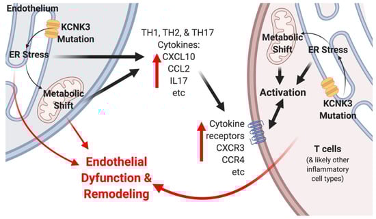 This explanation, which matches both the other literature on KCNK3 mutation in mice and rats [,,,], as well as the existing PH literature and the data presented in this project, would suppose that KCNK3 mutation primarily impacts ER calcium handling, resulting in ER stress and attendant metabolic alterations. In endothelium, this results in the changes seen in Figure 1 (human iPS) and 2E-F (mouse lung). These include changes in a variety of pathways related to metabolism, proliferation, and apoptosis, which are not themselves sufficient to drive PH, but which also signal to circulating cells. The circulating cells themselves are also impacted by KCNK3 mutation—possibly through the same mechanism. ER stress also impacts immune cell phenotype and immunometabolism [,,].