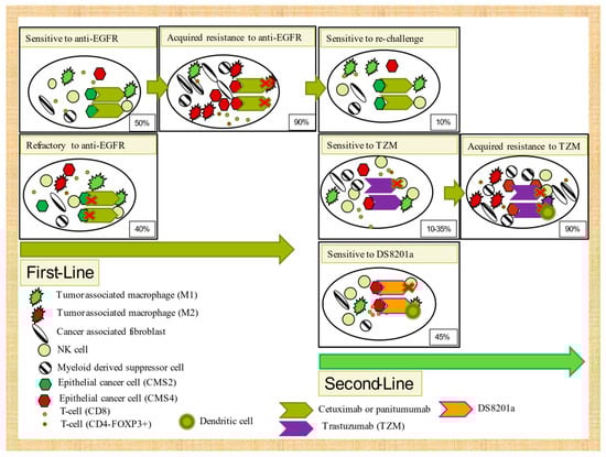 The identification of biomarkers of the response to anti-EGFR therapy has proven to be promising. The monoclonal antibodies cetuximab and panitumumab, which neutralize the extracellular domain of EGFR, have demonstrated effectiveness, in terms of both a better response and improved survival when used as first-, second-, or third-line treatment regimens. Unfortunately, however, patients with mCRC who have mutant RAS (KRAS/NRAS; ~55%) or BRAF (V600E; ~5–10%) genes do not derive any therapeutic benefit from anti-EGFR drugs [,]. Although patients with wild-type (WT) RAS and BRAF (30–35% of mCRC patients) are sensitive to first-line chemotherapy plus anti-EGFR treatment (best overall response (BOR) range, 55–75%) [,,], most of these patients develop resistance within the first 2 years. Primary inter- and intratumor heterogeneity and acquisition of secondary RAS and BRAF mutations during the course of such treatments are the major factors responsible for acquired resistance [,,,,,,,] (Figure 1). The recent gene expression-based molecular classification of consensus molecular subtypes (CMSs) has demonstrated the existence of phenotypic heterogeneity in CRC [], highlighting the need for improved risk stratification and selection of patient populations before any specific treatment options are offered. Although the CMS classification in mCRC suggested prognostic significance, its clinical significance in terms of predicting the response to anti-EGFR therapy remains unclear [,,]. Furthermore, given that genetic mutations can induce certain gene expression phenotypes in CRC, a comprehensive phenotypic exploration (including not only cancer epithelial cells, but also the tumor cell-type microenvironment) is critically required to establish biomarkers that can robustly predict the response to anti-EGFR therapies.