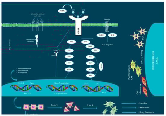 Schematic diagram of the IGF1R pathway. IGF1R phosphorylates the scaffold proteins IRS1 and can bind both PI3K (via the p85 subunit of PI3K) and the GRB2-SOS complex. PI3K activates downstream signaling (AKT, MTOR), whereas GRB-SOS stimulates RAS to activate the MAPK pathway (RAF/MEK/ERK). Both pathways can stimulate transcription factors such as c-Myc, c-Fos, and c-Jun to promote cell survival, proliferation, invasion, and metastasis. IGF1R crosstalks with integrins and RACK1 and FAK proteins and promotes cell migration. In addition, IGF1R SUMOylation and EMT can also contribute to proliferation and apoptotic resistance. Interaction with other RTKs such as HER2, MET, and EGFR constitutes an alternative IGF1R pathway. Finally, IGF1R signaling can also promote an immunosuppressive tumor microenvironment.
