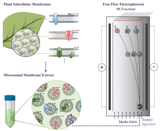 Schematic diagram of the working principle of Free Flow Electrophoresis (FFE) for plant subcellular membrane fractionation. Subcellular membranes with different origins (organelle/subcellular compartment) possess different overall surface charges mainly due to the chemical and compositional diversity of membrane lipids and proteins. In general, membranes exhibit negative surface charges around a neutral pH. Subcellular membranes form vesicles during the microsomal extraction procedure as described in “Materials and Methods”. Microsomal membranes are injected into the chamber and subjected to a high-voltage electric field. Membranes separate according to their distinct surface charge.