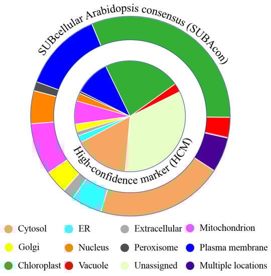 Percentage of the number of distinct proteins for each compartment by (inner pie chart) high-confidence markers (HCM) assignment and (outer pie chart) SUBcellular Arabidopsis consensus (SUBAcon) predictions.