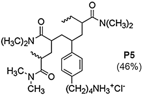 As for its antibacterial effects against B. subtilis, S. aureus, and E. faecium, P7 proved to be more potent than the homopolymer (Poly1), containing benzylamine residues, reported by Gelman et al. (2004) []. P7 displayed MIC values (µM) that were 4.3 times lower against B. subtilis, 4.3–8.3 times lower against E. faecium, and values that were two times lower against S. aureus. Against E. coli, P7 displayed MIC values (µM) that were 2–4 times lower than those of Poly1. Like the cationic antibacterial copolymer, we recently reported [], P7 was ineffective against a colistin-resistant strain of P. aeruginosa, due to a reduced possibility of electrostatic interactions with the outer membrane of the isolate, caused by an adaptive modification of lipid A [,]. Additionally, P7 was found to be more active than a derivative of the potent natural cationic peptide magainin II, known as Ala8,13,18-magainin 2 amide, and which has been reported to exhibit potent antimicrobial activity.