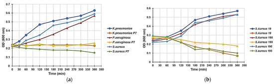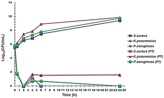 The kinetics of growth in MH broth of the selected strains of P. aeruginosa, K. pneumoniae, and S. aureus used in time–kill studies were monitored at 600 nm for 6 h in the absence and presence of P7, which was used at a concentration of 4 × MIC. Figure 4 illustrates the results obtained for one representative strain of P. aeruginosa, K. pneumoniae, and S. aureus.
