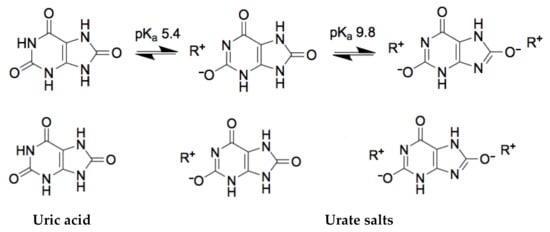 - Benn, C.L.; Dua, P.; Gurrell, R.; Loudon, P.; Pike, A.; Storer, R.I.; Vangjeli, C. Physiology of hyperuricemia and urate-lowering treatments. Front. Med. 2018, 5, 160. [Google Scholar] [CrossRef]