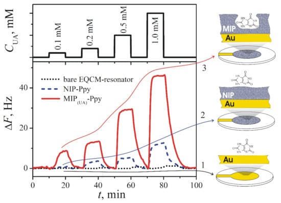 - Plausinaitis, D.; Sinkevicius, L.; Samukaite-Bubniene, U.; Ratautaite, V.; Ramanavicius, A. Evaluation of Electrochemical quartz crystal microbalance based sensor modified by uric acid-imprinted polypyrrole. Talanta 2020, 220, 121414. [Google Scholar] [CrossRef]