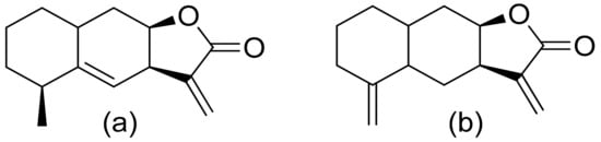- Picman, A.K.; Schneider, E.F. Inhibition of fungal growth by selected sesquiterpene lactones. Biochem. Syst. Ecol. 1993, 21, 307–314. [Google Scholar] [CrossRef]