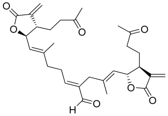 The Villarreal group reported that lactones from Asteraceae species have both antibacterial and anti-yeast actions. They tested various lactones from the germacrolide, heliangolide, and eremophilanolide groups against Escherichia coli (ATCC8937), Pseudomonas aeruginosa (ATCC9027), Staphylococcus aureus (ATCC6538), and Candida albicans (ATCC10231). The results proved that almost all tested lactones were good growth inhibitors with MIC values ranging from 50–400 µg/mL []. There are also active lactones among terpenoids from the soft coral genus Sinularia []. Flexibilide and sinulariolide (Figure 2) both possess an α-methylene-lactone moiety. Both showed activity against Bacillus subtilis and S. aureus, although they were not active against fungi and Gram-negative bacteria. The authors indicated that the activity of those compounds is related to the alkylating centers or hemiacetal moieties in the molecule [].