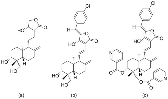 Inflammation is a very complex phenomenon, and therapeutic agents might impact different aspects of this process. Inflammation is initiated by the secretion of proinflammatory cytokines such as interleukin 6 (IL-6), interleukin 8 (IL-8), and tumor necrosis factor (TNF-α), as well as the production of reactive oxygen species. Dai and colleagues revised the anti-inflammatory activity of andrographolide and its derivatives. They verified their ability to inhibit NO (nitric oxide) and PGE2 (prostaglandin E2) production, and also verified their impact on dimethylbenzene-induced mouse ear edema and egg albumin-induced rat paw edema. Three compounds (Figure 12) inhibited ear edema in mice at a dose of 0.90 mmol/kg body weight. Additionally, satisfactory results were observed against rat edema, with lactone c in Figure 12 showing the best reduction results at a dose of 0.90 mmol/kg body weight. All three compounds reduced PGE2 production at 1.35 mmol/kg and increased vascular permeability. At this same concentration, two compounds (Figure 12a,b) reduced NO production. Once again, compound c in Figure 12 obtained the best result at the dose of 0.90 mmol/kg. The great anti-inflammatory activity of compound c in Figure 12 is caused by the inhibition of iNOS activity and the reduction of NO production, moreover, it was the most potent α-glucosidase inhibitor [].