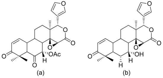 Malaria is a disease that threatens human wellbeing and affects millions of people worldwide. This disease is caused by different species of the genus Plasmodium []. Artemisinin is the second treatment after quinine, and artemisinin derivatives are known as antimalarial compounds. This compound has been used as a drug since 1979, mostly in patients with chloroquine-sensitive or chloroquine-resistant strains of P. falciparum []. Its key pharmacophore is 1,2,4-trioxolane cycle spiro-conjugated with sesquiterpene δ-lactone []. The Pereira group tested limonoids and their derivatives from biomass after the production of andiroba oil for their in vitro and in vivo antiplasmodial activity. 6α-Acetoxygedunin and 6α-hydroxydeacetylgedunin (Figure 16) possessed the best in vitro activity against the P. falciparum K1 strain, with IC50 values of 7.0 and 5.0 μM, respectively. Compound a in Figure 16 was also tested in vivo in a rodent malaria model against P. berghei NK65. Compared to untreated animals, 65.7% suppression of parasitemia was observed at the oral dose of 100 mg/kg/day [].