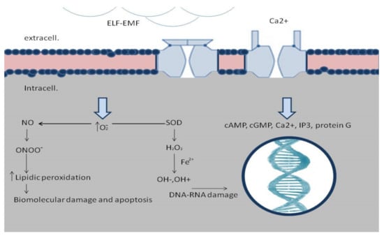 Molecular mechanisms of ELF-EMFs’ effects on cell function. ELF-EMFs open voltage-dependent calcium channels, causing interference in cell differentiation with Ca2+ influx into cells. It is well documented that Ca2+ ions affect activity-dependent gene expression, and this effect is mediated by signaling pathways activating Ca2+-responsive DNA regulatory elements. Decreasing antioxidants concentration has a defense mechanism against free radicals. The ELF-EMFs could also induce the production of oxygen (O2) in the cellular environment, which plays a major role in oxidative damage that, subsequently, led to biomolecular damage, DNA double strand breaks, DNA/RNA damage, and cell death.