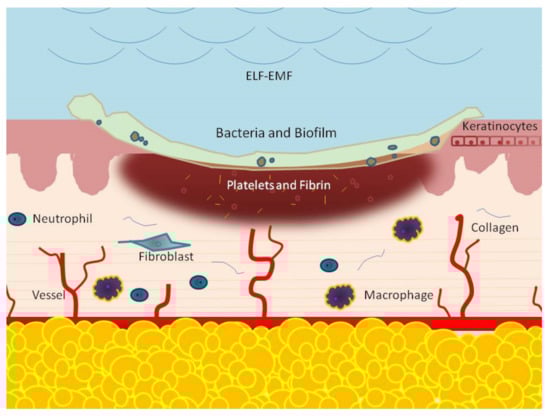 Wound healing is a complex, staged process. It involves extensive communication between the different cellular constituents of various compartments of the skin and its extracellular matrix (ECM). Different signaling pathways are determined by a mutual influence on each other, resulting in a dynamic and complex crosstalk. It consists of various dynamic processes including a series of overlapping phases: hemostasis, inflammation response, new tissue formation, and tissue remodeling. Interruption or deregulation of one or more of these phases may lead to non-healing (chronic) wounds. The most important factor among local and systemic exogenous factors leading to a chronic wound is infection with a biofilm presence. In the last few years, an increasing number of reports have evaluated the effects of extremely low frequency (ELF) electromagnetic fields (EMFs) on tissue repair. Each experimental result comes from a single element of this complex process. An interaction between ELF-EMFs and healing has shown to effectively modulate inflammation, protease matrix rearrangement, neo-angiogenesis, senescence, stem-cell proliferation, and epithelialization. These effects are strictly related to the time of exposure, waveform, frequency, and amplitude. In this review, we focus on the effect of ELF-EMFs on different wound healing phases.