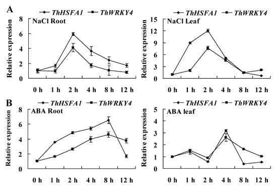 Expression patterns of ThHSFA1 and ThWRKY4 in response to abiotic stress. The transcript levels of ThHSFA1 and ThWRKY4 in roots and leaves from T. hispida seedlings treated with 300 mM NaCl (A) or 120 µM ABA (B) for the indicated times were measured by RT-qPCR. A fresh water only-treated control was established in parallel. The reference gene Thtubulin was used as an internal control. The error bars represent ± SD, which were calculated from multiple biological replicates.