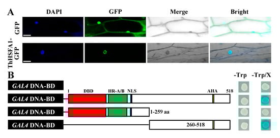 Subcellular localization and transcriptional activation assay of ThHSFA1. (A) Subcellular localization of ThHSFA1 protein. The 35S::GFP (control) and 35S::ThHSFA1-GFP were transformed into onion epidermal cells and visualized by DAPI staining. Scale bars = 10 µm. (B) Transcriptional activation activity of ThHSFA1 protein. The full-length and fragment cDNA of ThHSFA1 were fused to the GAL4 DNA-binding domain in the yeast vector pGBKT7 and expressed in Y2HGold yeast cells. The transformed yeast cells were plated on SD/−Trp and SD/−Trp/X-α-Gal media and then subjected to a β-gal assay.