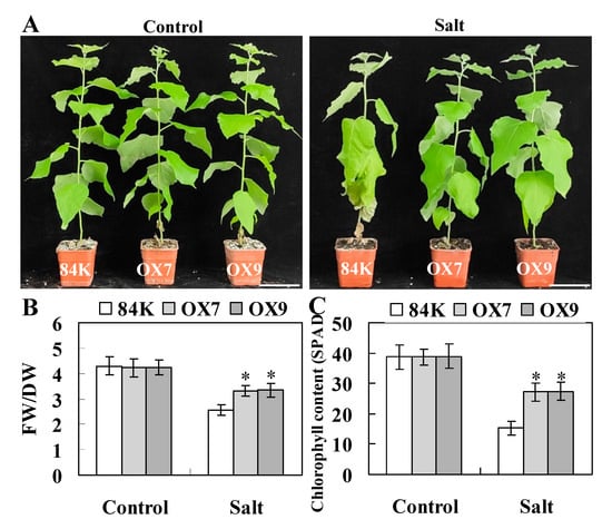 ThHSFA1-transformed and nontransgenic 84K poplar plants were propagated via in vitro microcutting. Shoot segments of transgenic and nontransgenic 84K poplars (~3 cm in length with 2–3 young leaves) were cut from sterilized seedlings and cultivated on 1/2 MS solid medium. To observe the growth of poplar plants under salt stress, 4-week-old transgenic and nontransgenic 84K plants were transplanted into plastic pots with a mixture of soil and perlite, grown for 30 days in a greenhouse at 25 °C, and irrigated subsequently with 0 (control) or 200 mM NaCl (salt treatment) solution every 2 days for 10 days. These plants were photographed, and the plant height, basal diameter, and fresh and dry weights were measured. Chlorophyll content in the 6th–8th leaves of each genotype was measured using a portable chlorophyll analyzer (SPAD-502 Plus, Konica Minolta, Japan). The treatment experiments were repeated three times, and at least 20 plants of each genotype were used per experiment.
