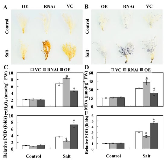 A previous study reported that constitutive expression of ThWRKY4 in Arabidopsis confers enhanced salt tolerance by improving ROS scavenging capability and antioxidant enzyme activity [7]. ThHSFA1 protein is an upstream regulator of ThWRKY4, so we speculated that ThHSFA1 may be involved in the same physiological regulatory pathway of the salt stress response. We first monitored the cellular levels of hydrogen peroxide (H2O2) and superoxide (O2•−) in different types of transiently transformed T. hispida plants and genotyped poplars by histochemical staining with 3,3′-diaminobenzidine (DAB) and nitroblue tetrazolium (NBT), with the intensity of staining representing the amount of H2O2 and O2•−. Under control growth conditions, there was no obvious difference between the transgenic and the corresponding control Tamarix (VC) and poplar (84K) plants. After salt stress, the leaf staining of transgenic Tamarix (OE) and poplar (OX) plants was weaker than those of the corresponding control plants (Figure 5A,B and Figure 6A,B). Furthermore, the blue and brown spots of transgenic Tamarix plants with knockdown of ThHSFA1 (RNAi) were darker than those of VC plants (Figure 5A,B). Quantitative measurement of H2O2 content revealed similar results and further demonstrated that H2O2 content in the transgenic lines of Tamarix and poplar was lower than that in the corresponding control plants (Figure 5C and Figure 6C). In addition, malondialdehyde (MDA) is a valid indicator of cytomembrane oxidative damage [43]. Under control growth conditions, MDA content was similar in transgenic and nontransgenic plants. However, transgenic Tamarix (OE) and poplar (OX) plants overexpressing ThHSFA1 displayed lower MDA levels than the corresponding control plants under salt stress conditions (Figure 5D and Figure 6D). Both histochemical staining and quantitative measurement indicated that overexpression of ThHSFA1 in transgenic plants reduced ROS accumulation under salt stress conditions.