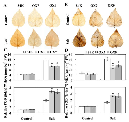 ThHSFA1 enhances ROS scavenging capability of transgenic poplar plants under salt stress. Leaves were collected from nontransgenic 84K and transgenic poplars before and after salt stress and used for histochemical staining including DAB (A) and NBT (B) staining, and physiological analyses, including measurements of H2O2 (C) and MDA (D) content and relative POD (E) and SOD (F) activity levels. Poplar plants were cultivated and subjected to salt stress (200 mM NaCl) every 2 days for 10 days as described in Figure 4. The error bars represent ± SD from multiple biological replicates, and the asterisks indicate significant differences between nontransgenic 84K and transgenic plants (*, p < 0.05).