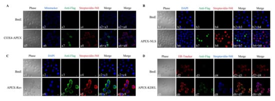 Transgenic BmE cells expressing APEX fused with a leading peptide including COX4, NLS, Rev, and KDEL were made for translocating the APEX in MM, nucleus, cytosol, and ER, respectively. For verifying the expression and subcellular localization of the APEX, a FLAG tag was inserted between the APEX and leading peptide. The expression of COX4-FLAG-APEX, APEX-FLAG-NLS, APEX-FLAG-Rev, and APEX-FLAG-KDEL was determined using Western blotting with an antibody against the FLAG (anti-FLAG). As a result, the fusion proteins were expressed explicitly in transgenic cells (Figure 1A).