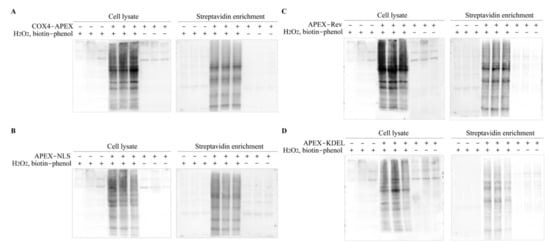 Before the enrichment of the biotinylated proteins, we first determined the biotinylation in whole-cell lysate using Western blotting with streptavidin-HRP (Figure 3A–D). As a result, no biotin-labeled protein was detected in the negative control groups, while abundant biotinylated proteins were found in the experimental groups. Moreover, a significant difference in biotinylation was observed among the samples from the nucleus, MM, cytosol, and ER, suggesting that proteins in targeted organelles were successfully labeled by biotin. The biotinylated proteins were enriched using streptavidin-coated magnetic beads and then verified by Western blotting, the results of which manifested the successful enrichment (Figure 3A–D).