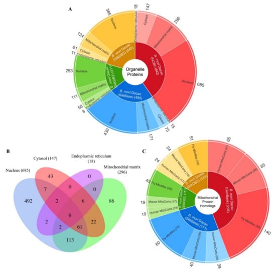 Silk moth is a large group of lepidopteran insects that includes the domestic silkworm Bombyx mori and some wild animals such as Actias selene, Antheraea assamensis, Antheraea pernyi, Bombyx huttoni, Bombyx mandarina, Caligula japonica, Eriogyna pyretoum, Philosamia cynthiaricini, and Samia cynthia. The B. mori is an economically important insect and has become a model organism for lepidoptera. To date, three silkworm genomes from the B. huttoni, B. mandarina, and B. mori have been sequenced and deposited in the GenBank database under the accession numbers GCA_002197625.1, GCA_003987935.1, and GCA_000151625.1, respectively. The genomic and genetic maps greatly promoted studies of the functional and comparative genomics of silkworms [,,], especially with a high-quality genome assembly of B. mori obtained and published recently []. This improved assembly and annotation provided a more accurate reference for transcriptomics and proteomics studies. Referring to the genome sequence, large-scale transcriptome analysis of silkworms was performed with microarray and RNA-seq technologies, respectively [,]. Transcriptional profiles in different tissues and at different development stages partially indicate the functional characteristics of silkworm protein-coding genes; however, these need to be further revealed at the proteomics level. Silkworm proteomes have been further dissected at the organ and tissue levels. Proteins from the head, silk gland, colleterial gland, hemolymph, midgut, embryo, and spinneret have been isolated and identified with mass spectrometry [,,,,,,,,,]. In addition, silkworm proteomic responses against infections by virus, bacteria, and fungi pathogens have also been widely investigated using high-throughput methods [,,,,,]. To date, little is known about the protein composition of silkworm subcellular organelles like the nucleus, mitochondria, cytosol, and endoplasmic reticulum (ER), except that Wang et al. isolated proteins from the cytosol, mitochondria and microsomes of silkworm infected by nucleopolyhedrovirus []. However, organelle proteomes that identified with targeted and accurate isolation methods have not been reported in silkworms.