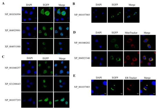 Verification of protein locations in BmE cells. The identified proteins were fused with EGFP and transfected BmE cells. The nucleus, MM, and ER were stained with DAPI (blue), MitoTracker (red) and ER-Tracker (red), respectively. (A) Subcellular localization of proteins identified in nucleus and cytosol. (B–D) Subcellular localization of proteins identified in the cytosol, nucleus, and MM, respectively. (E) Subcellular localization of protein identified in ER. The IDs indicate the GenBank accession number for each protein.