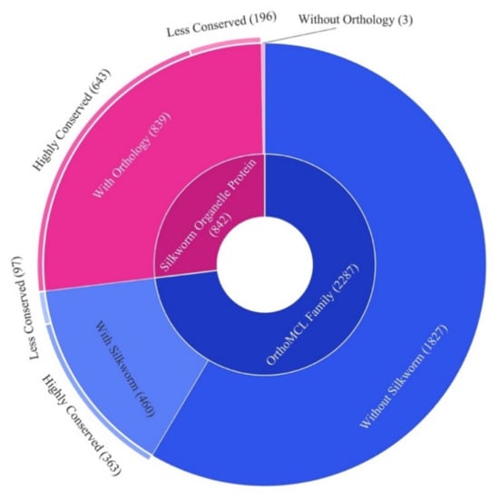 Summary of orthology for the identified silkworm organelle proteins annotated in the GenBank data. Pies in blue show the summary of protein families. Pies in magenta indicate the summary of silkworm organelle proteins included in families.