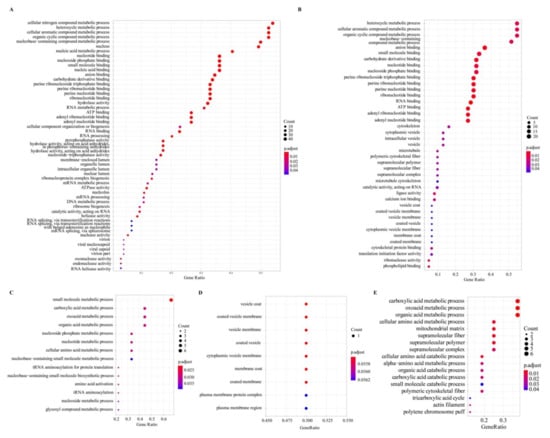GO enrichment for silkworm organelle proteins of the nucleus (A), MM (B), cytosol (C), ER (D), and MitoMax homologs (E).